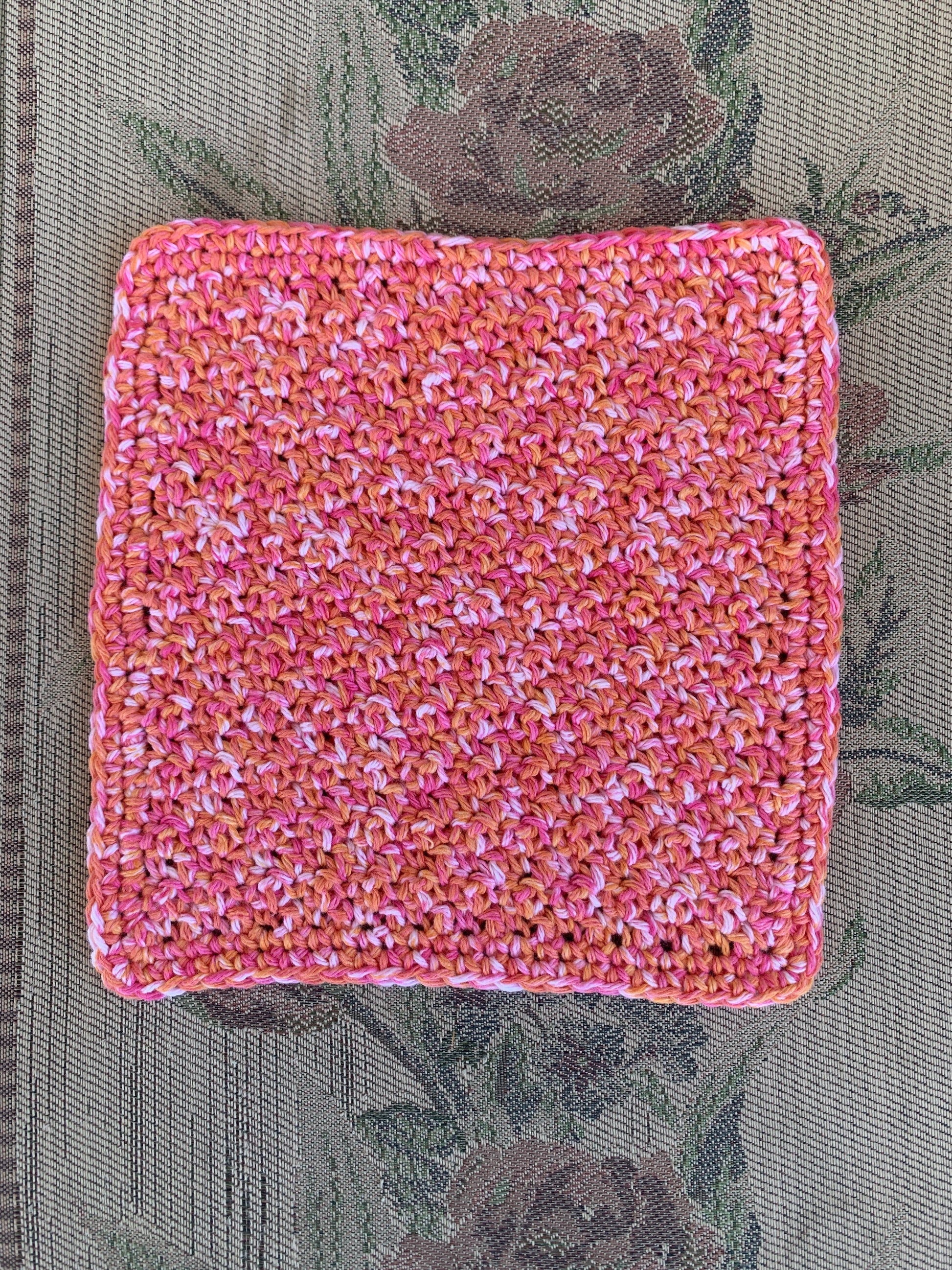 Dishcloth with pink/orange (coral) tie-dye colours. Made with cotton yarn.