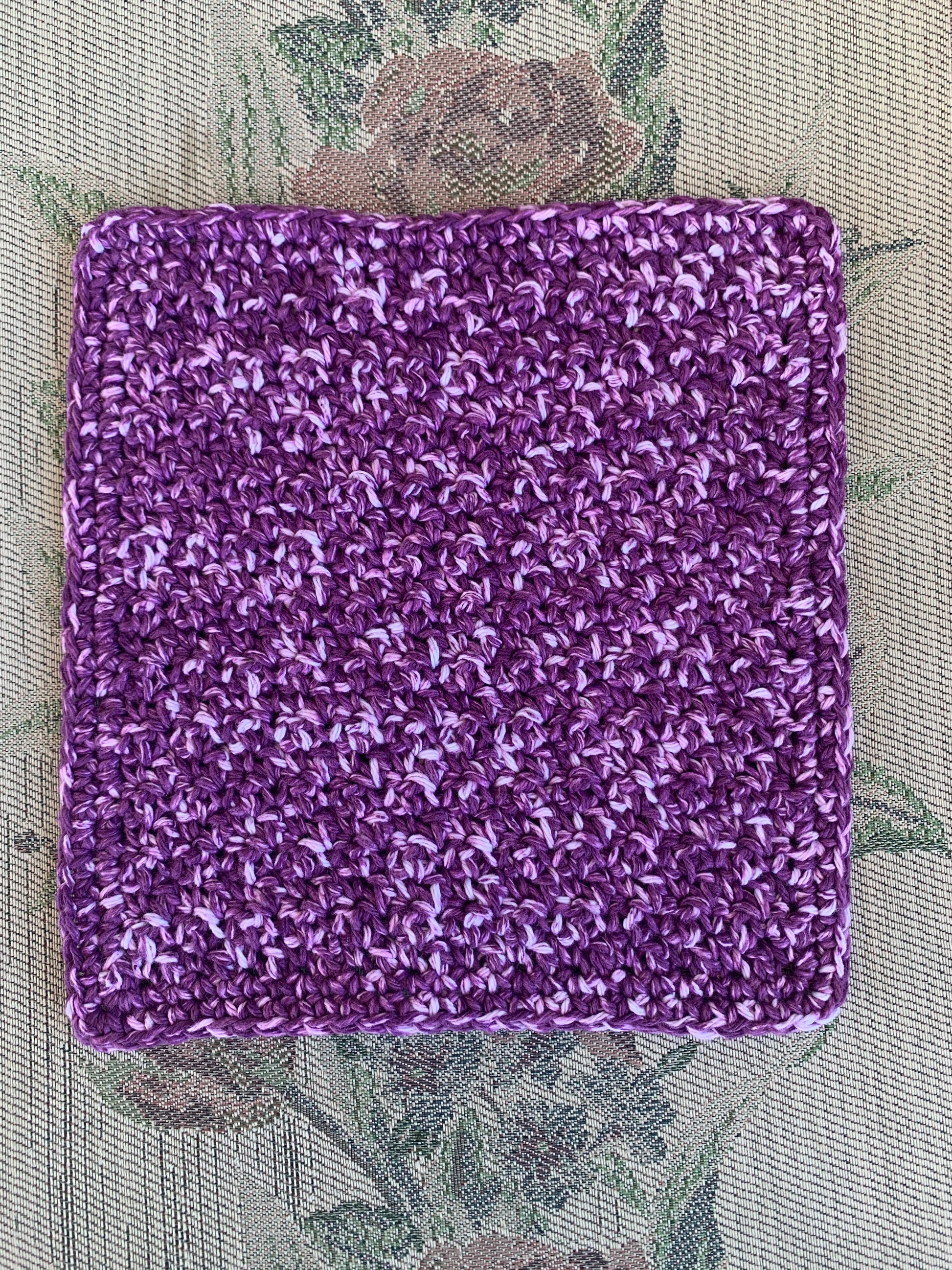 Dishcloth with purple tie-dye colours. Made with cotton yarn.