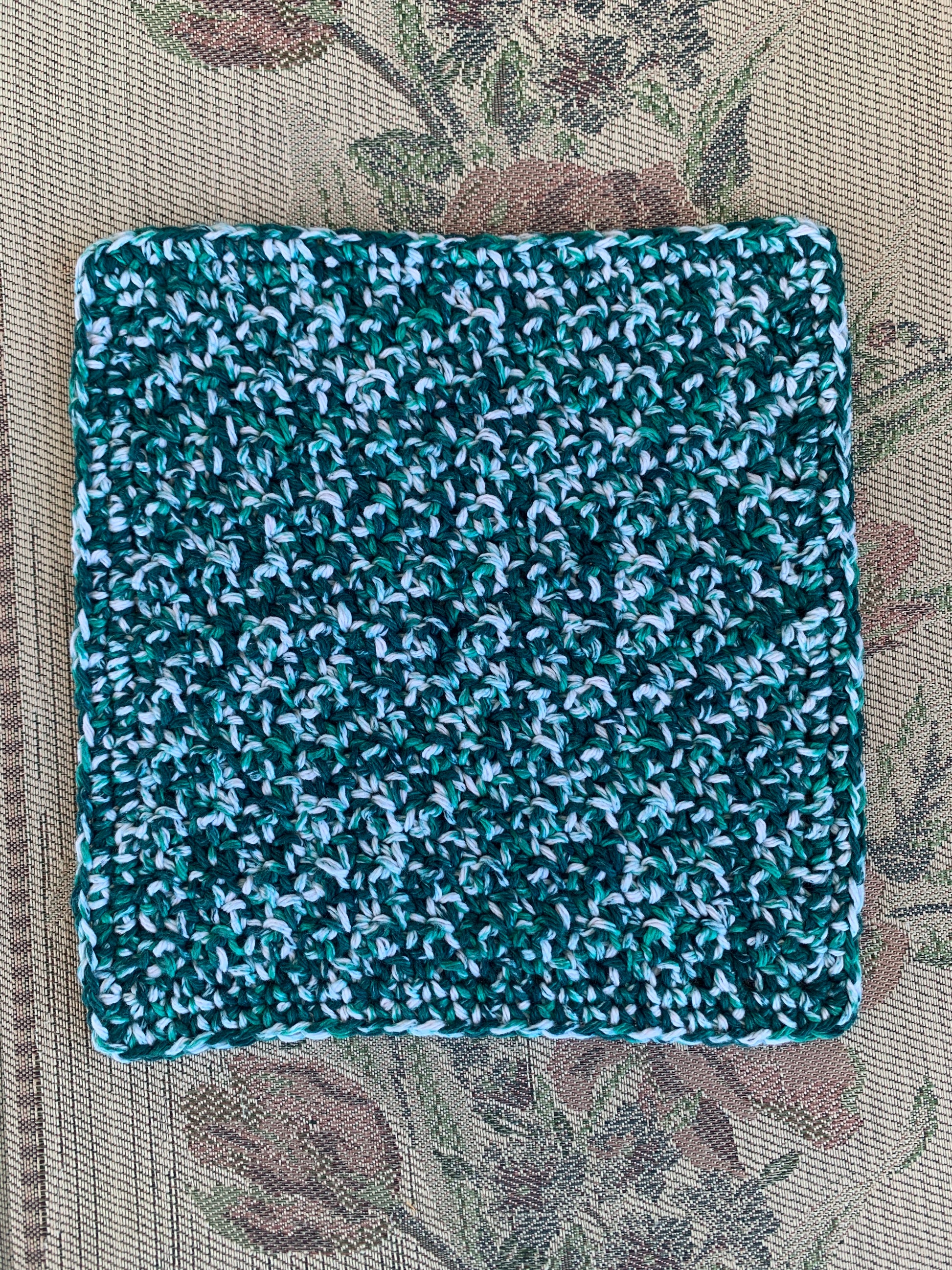 Dishcloth with teal tie-dye colours. Made with cotton yarn.
