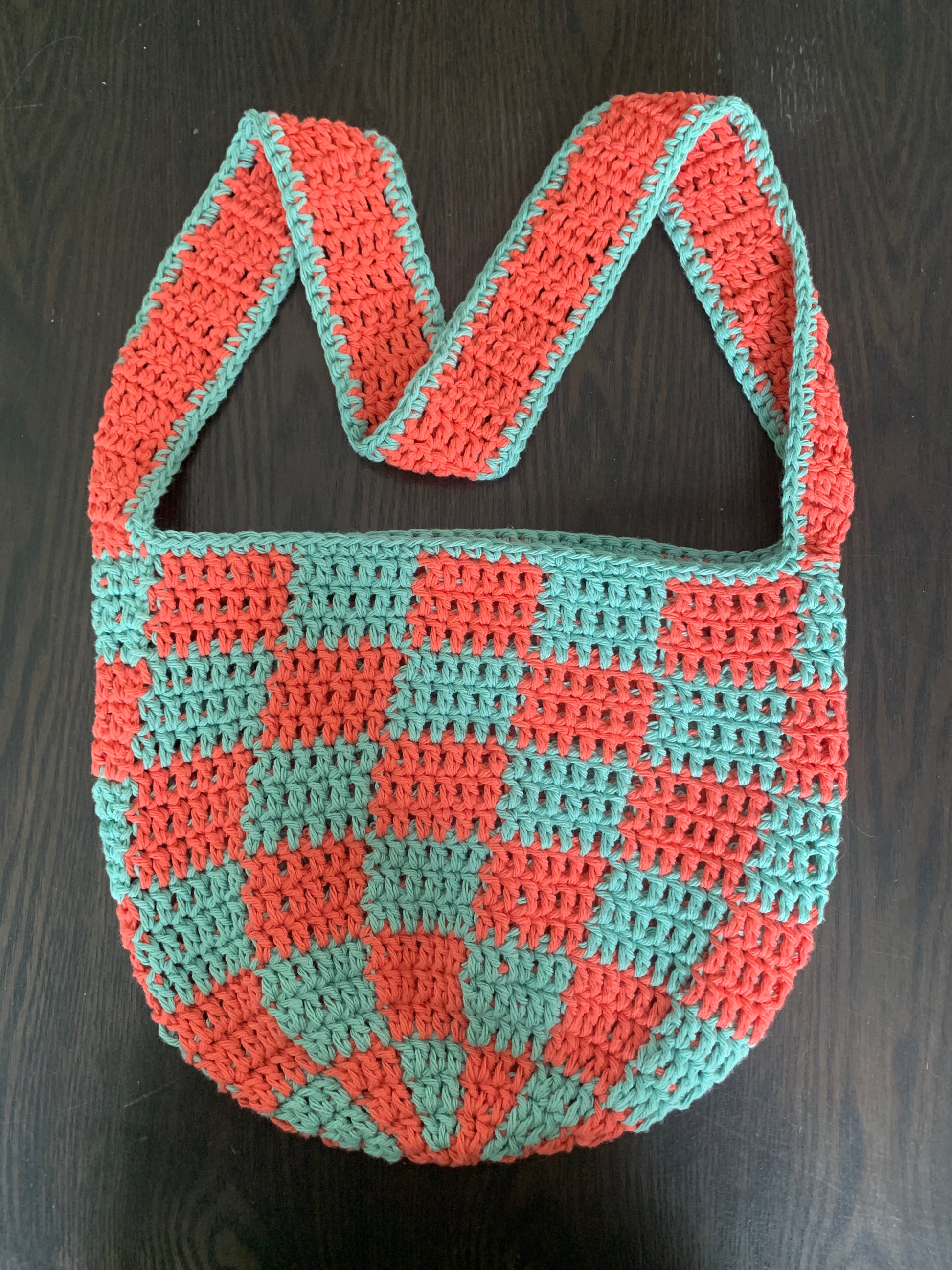 Orange and Turqouise over the shoulder bag. Made from cotton yarn.